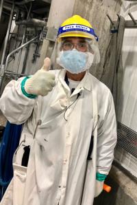 One World Beef Packers employee with PPE's.