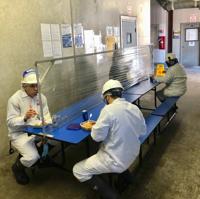 One World Beef Packers employees at lunch utilizing separation screens and social distancing.
